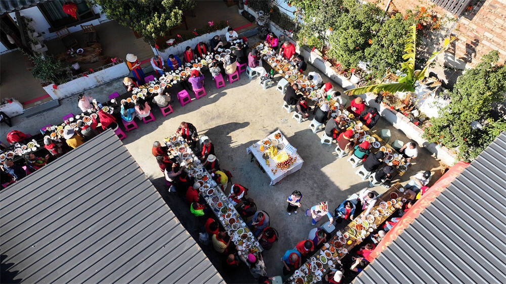 除夕当天,广南县莲城镇大革假村举办“全村同吃年夜饭”活动,村民们拼接长街宴、共品家乡味、共话家乡发展变化。村民王曙光说:“过去大家过年各过各的,如今聚在一起吃年夜饭,比的是和气,讲的是团结,倡的是节俭,不仅拉近了邻里距离,更凝聚起大家同心干事、共建美好家园的强大合力。”