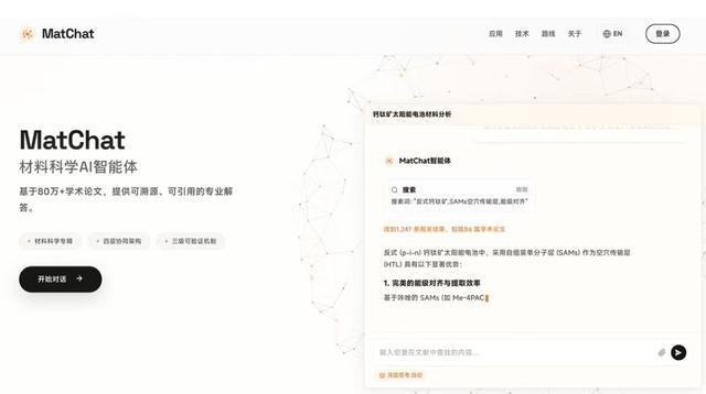 除知识库外,MatChat 2.0在响应效率、领域理解、应用场景三大维度同步实现核心升级。响应效率方面,引入全新的动态路由算法与知识检索优化技术,平均响应时间压缩至秒级,实现即时文献调研支持;在领域理解方面,系统采用四层协同架构,智能上下文持久层支持十余轮持续深度对话,意图分类与路由层精准识别用户需求,有效过滤无效信息干扰,智能体推理与执行层兼顾深度思考与快速响应两种模式,学术知识数据库引擎整合近百万量级的权威文献资源,共同保障复杂研究场景下的连贯交互体验与专业理解。 应用场景方面,覆盖材料合成与制备、性能表征与测试、学术论文撰写、项目申报等多个环节,可为科研工作提供专业、智能、可靠的支持服务。